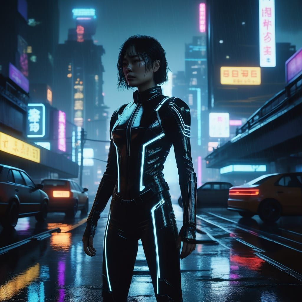 This image depicts a striking female superhero in a dark, gritty urban environment, illuminated by vibrant white neon lights and surrounded by towering skyscrapers, with a moody, cinematic atmosphere and deep shadows.