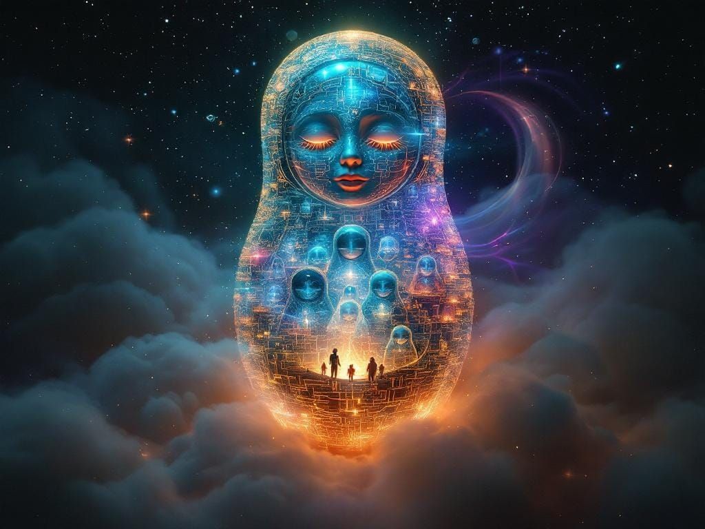 cutaway view giant cyber matryoshkas revealing inner workings of neuromorphing inter-harmonics dimetric view detail so fine it appears infinite reflections symbolising introspection and dreams about another entity backed by exoembodiment swirling nebulous fog that refracts and absorbs the surrounding ...