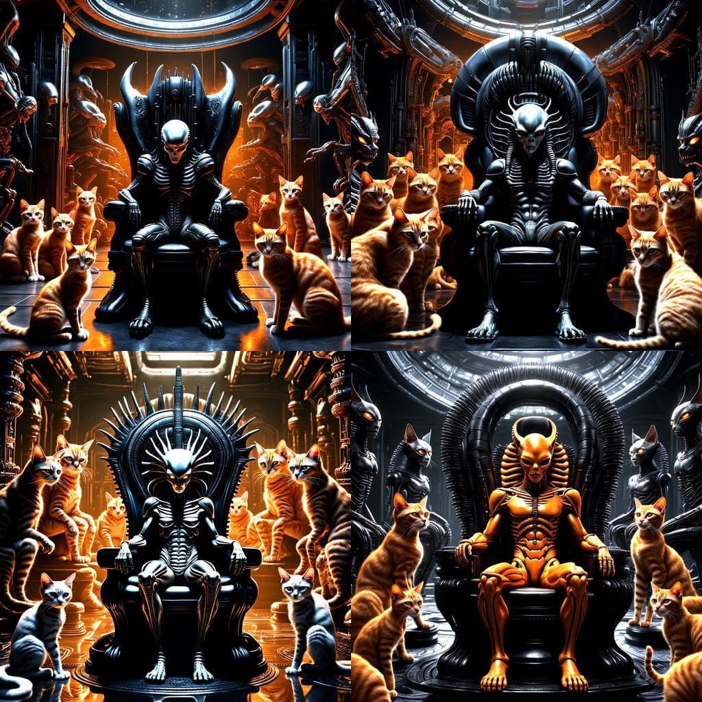 A surreal image of an H.R. Giger-inspired alien on a throne, encircled by numerous orange tabby cats and kittens. The artwork features a detailed, dark background in a fantastical and intricate style.