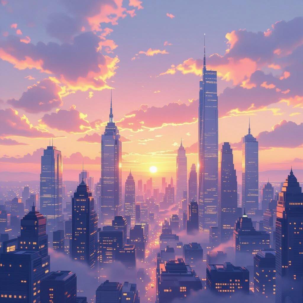 A stunning pastel cityscape at dusk in ultra-high definition. The modern metropolis features glass towers reflecting the sunset, with warm amber windows and a misty atmosphere. Rendered as digital art with soft, delicate lighting.