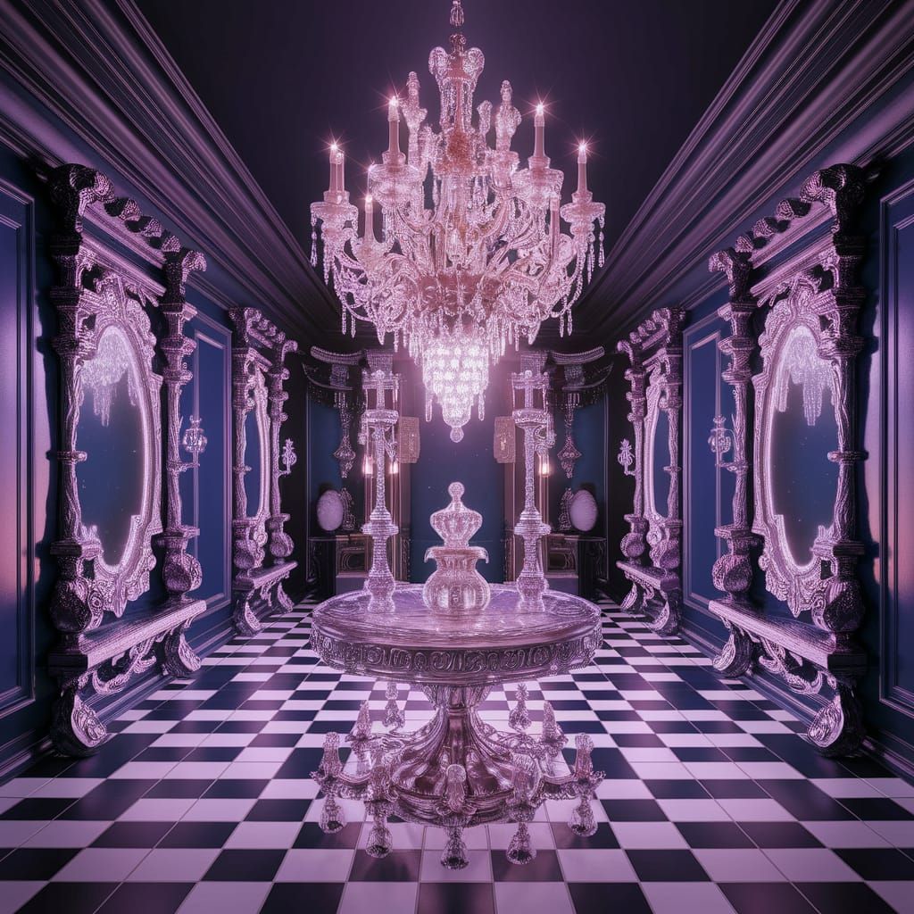 A magical scene filled with refracting light and rainbow shadows. The glass objects emit light that splits into vibrant colors, creating a surreal and enchanting atmosphere. Warm colors evoke wonder and beauty.