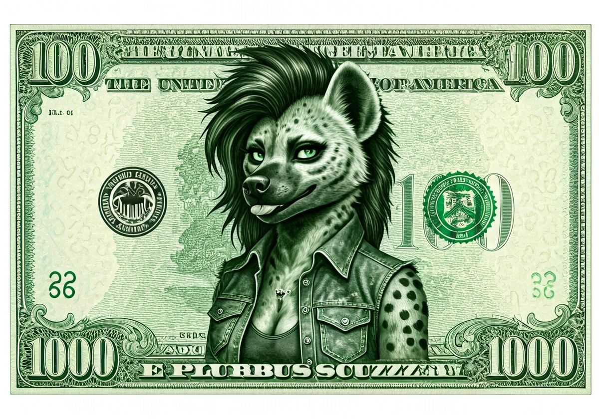 This image showcases a close-up of a dirty, green $1000 bill featuring a unique portrait and a neon-signed dive bar with an owl emblem. Intricately detailed and realistic.