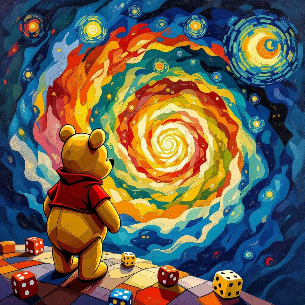 A surreal image shows Winnie the Pooh made of dice gazing into a swirling vortex of warm colors. The scene evokes vertigo art through warped geometry and infinite spirals, reminiscent of Van Gogh.