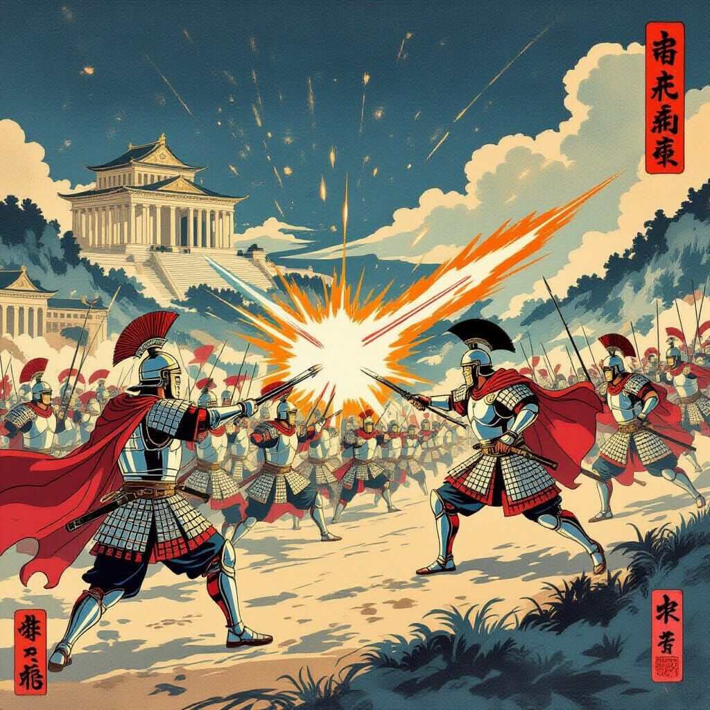 Generate your own vivid ukiyo-e style Futuristic Roman Empire battle scenes. Free and easy AI image creation.