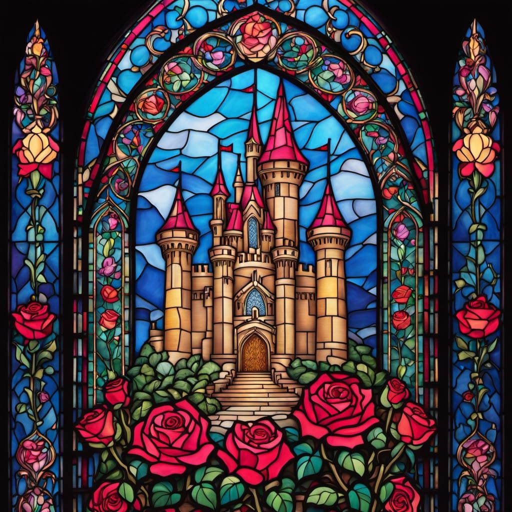 This image is a stunning stained glass interpretation of the iconic Beauty and the Beast castle, surrounded by roses and set against a sleek stainless glass background, in a vibrant and colorful style.
