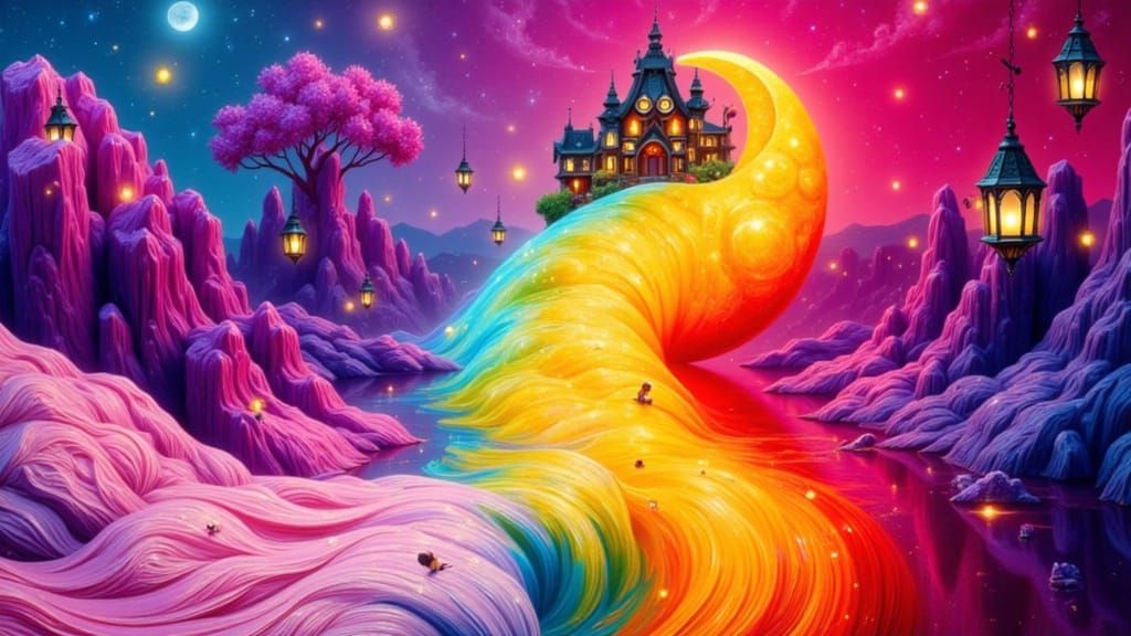 A striking picture of a miniature village inside a crescent moon. The idyllic landscape features tiny houses, lanterns, and glowing flora, rendered with triadic colors and maximalist detail in an oil painting style.