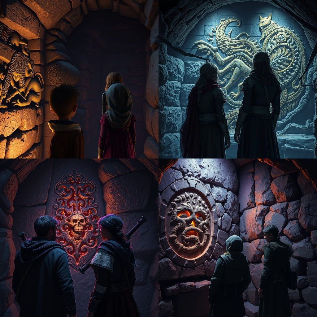 This image shows a brother and sister examining ancient carvings in a dark, medieval basement. The scene is depicted as detailed dark fantasy concept art with dynamic and volumetric lighting.