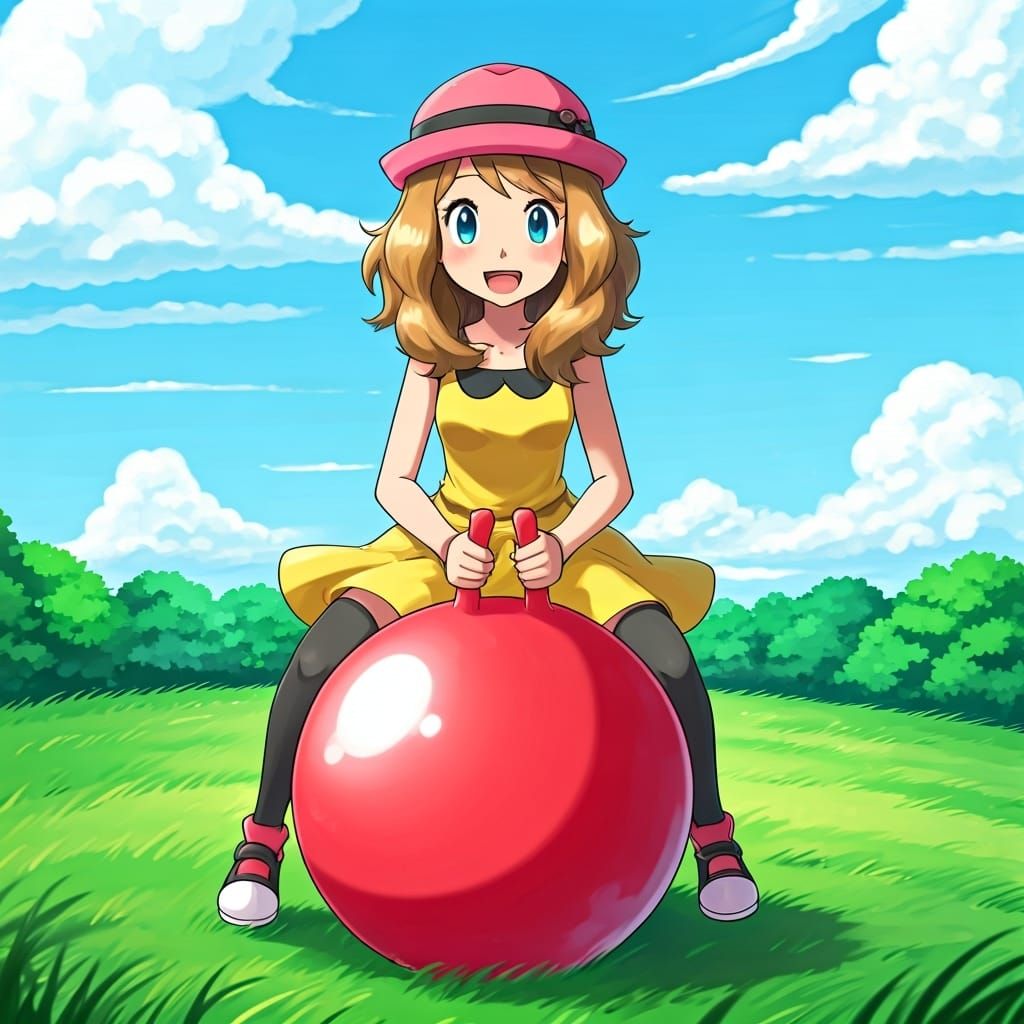 This image shows Pokémon trainer Serena enjoying a vibrant red Space Hopper ball. The scene is set against a backdrop of lush greenery and fluffy clouds, rendered in a whimsical anime style.