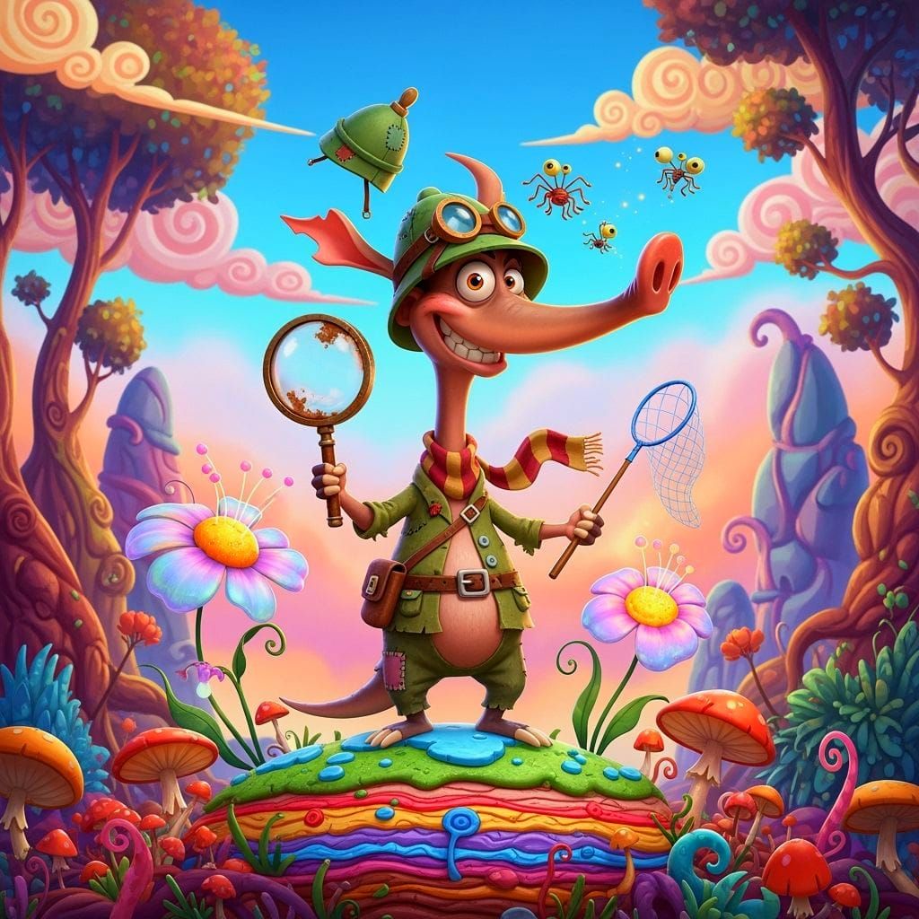 This image shows a funny cartoon of an anthropomorphic aardvark. The 3D caricature is intricately detailed and textured in a whimsical style.
