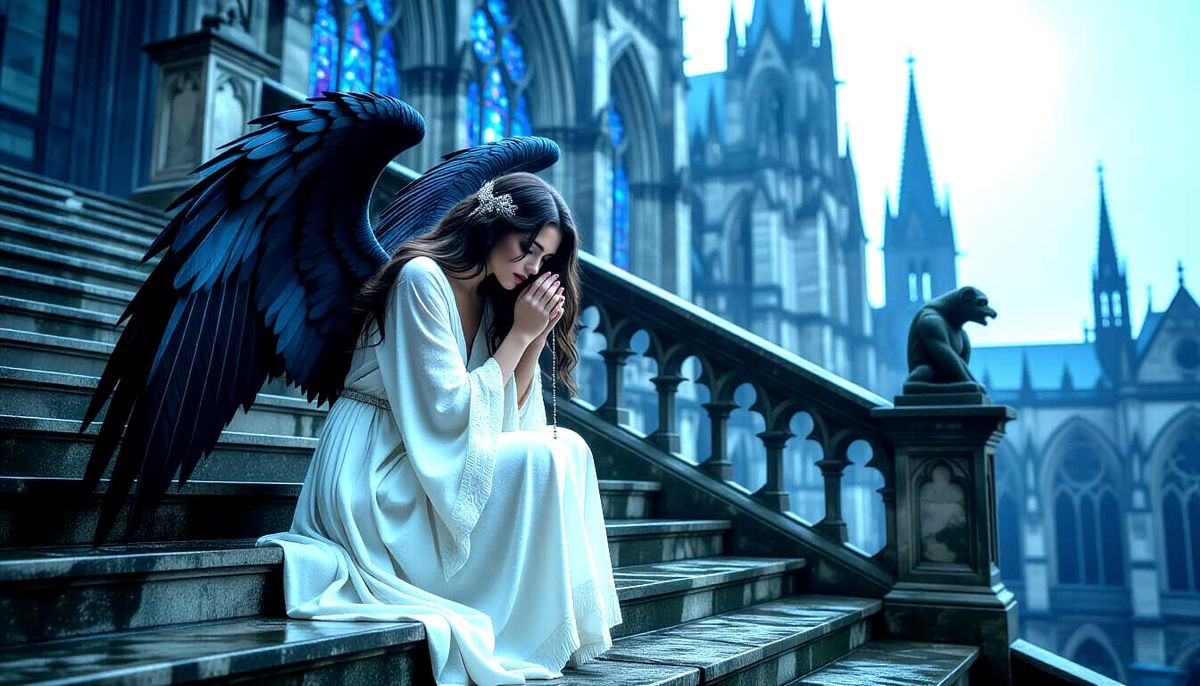 A sorrowful fallen angel kneels on a mossy gothic staircase. The dramatic image features a cathedral backdrop, soft lighting, and detailed textures, rendered with a photorealistic digital art style.