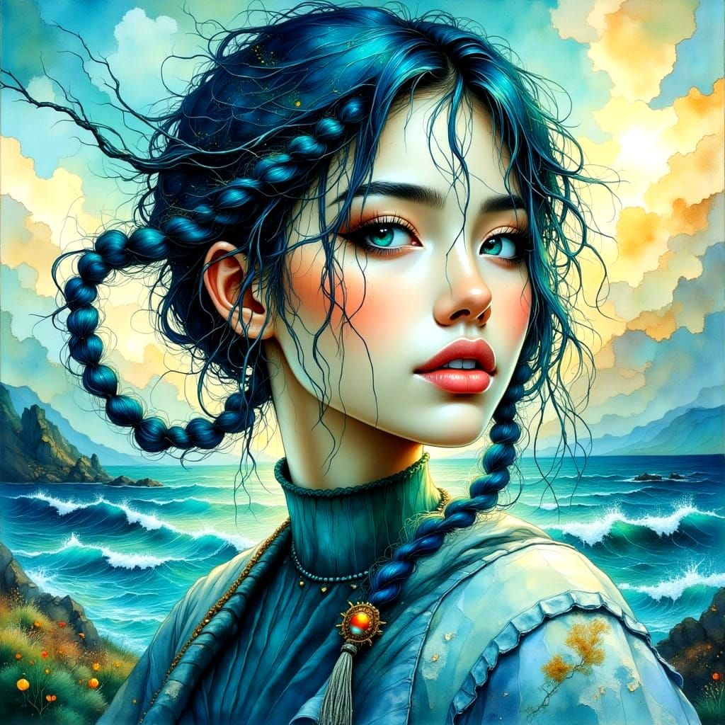 A striking picture of a woman with teal hair and aqua eyes, set against a turbulent turquoise ocean backdrop. Soft golden clouds accent the deep blue scene, rendered with watercolor and alcohol ink.