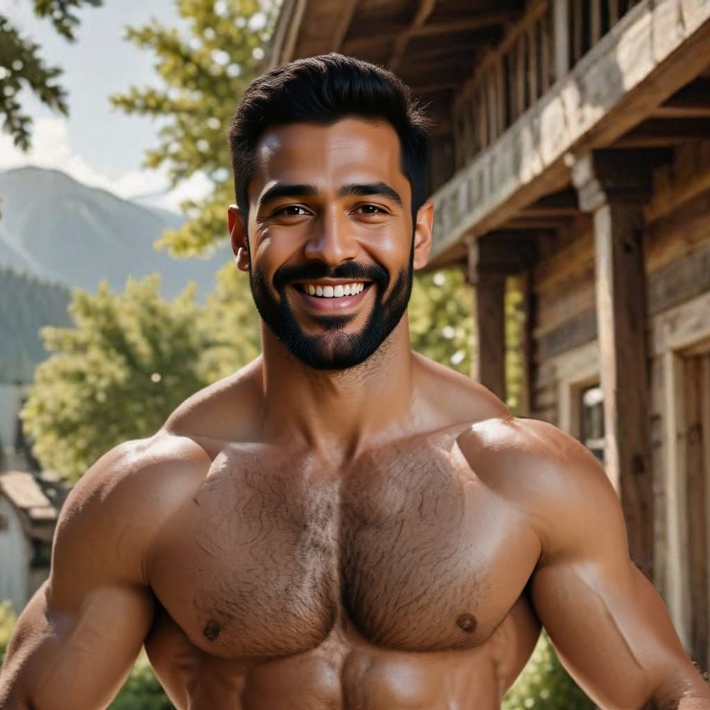 This image shows a handsome Brazilian man with tan skin and black hair, smiling slightly. The image features natural-looking chest hair, capturing a moment of relaxed enjoyment.