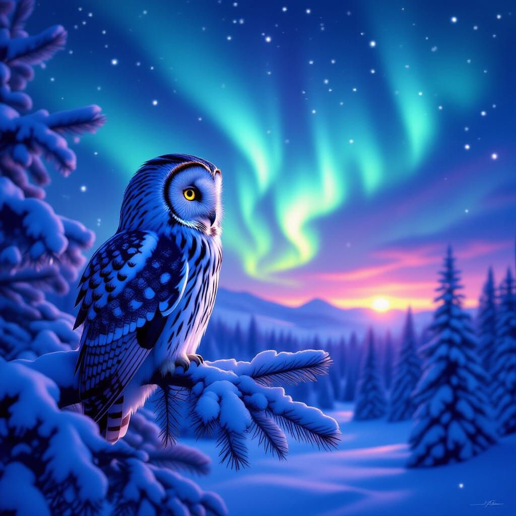 A stunning image shows an owl perched on a snow-covered branch, observing the aurora borealis over a winter forest. The scene is rendered with cold tones and luminous skies as photorealistic digital art.