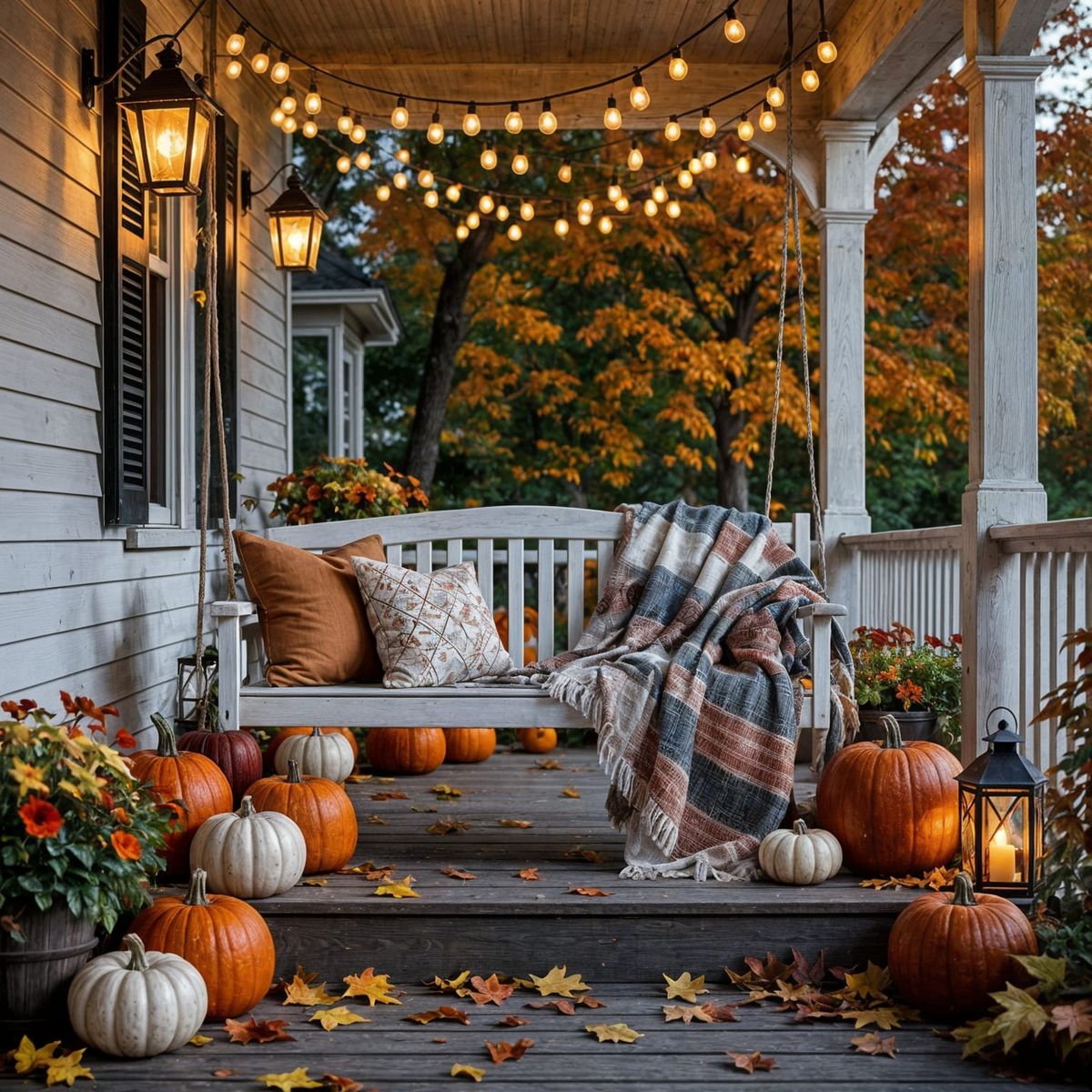This image shows a hyper-realistic scene of a classic wooden front porch at night, illuminated by warm Edison string lights. It features a white swing, pumpkins, and autumn leaves, rendered with photorealistic lighting and a warm color palette.