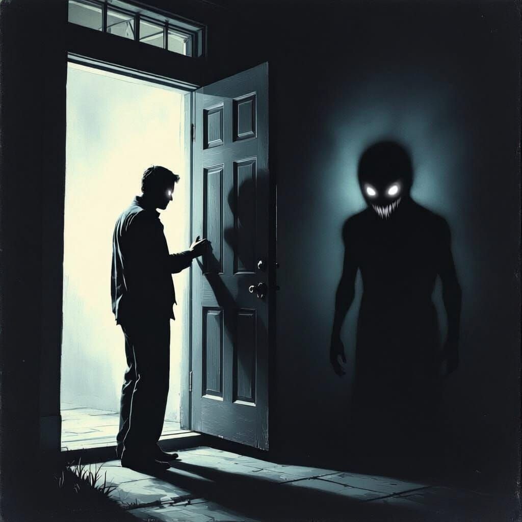 This image shows a man opening his house door at night to reveal a shadowy figure with glowing red eyes standing outside. A suspenseful and eerie scene.