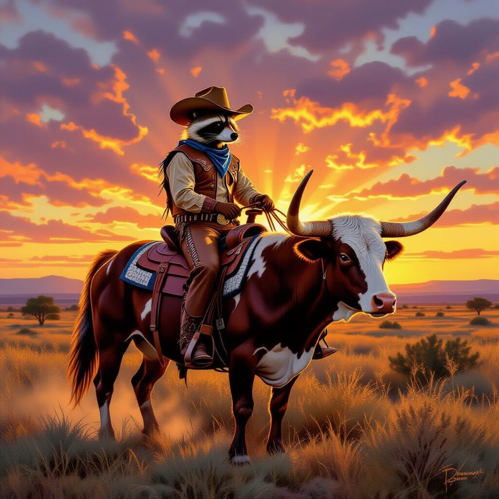 A raccoon dressed as a cowboy rides a longhorn in a Texas landscape. Warm lighting and intricate textures evoke a Western aesthetic.