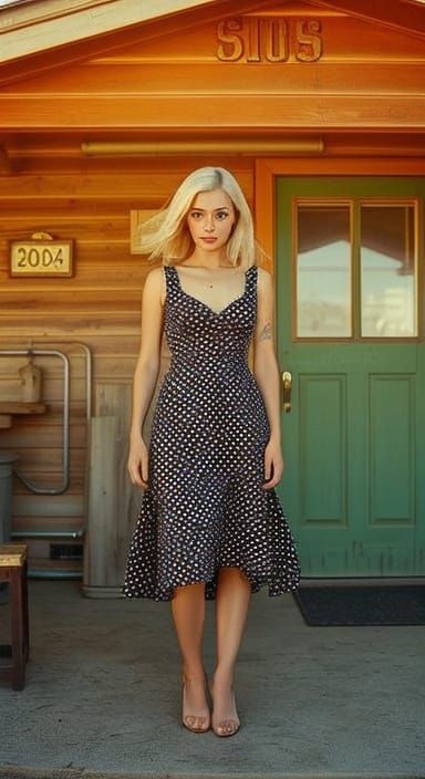 A striking picture of a blonde woman with pink hair standing in a dress. The image captures a sense of staged authenticity with amber light and golden hour tones, reminiscent of late 70s cinematography.