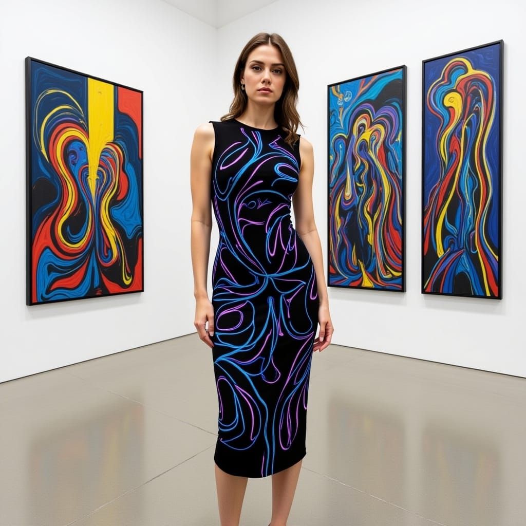 This image shows a woman in a black dress standing in an art gallery. Her body is painted with neon colors that match the abstract art, creating a surreal and elegant effect. The image is reminiscent of art nouveau.