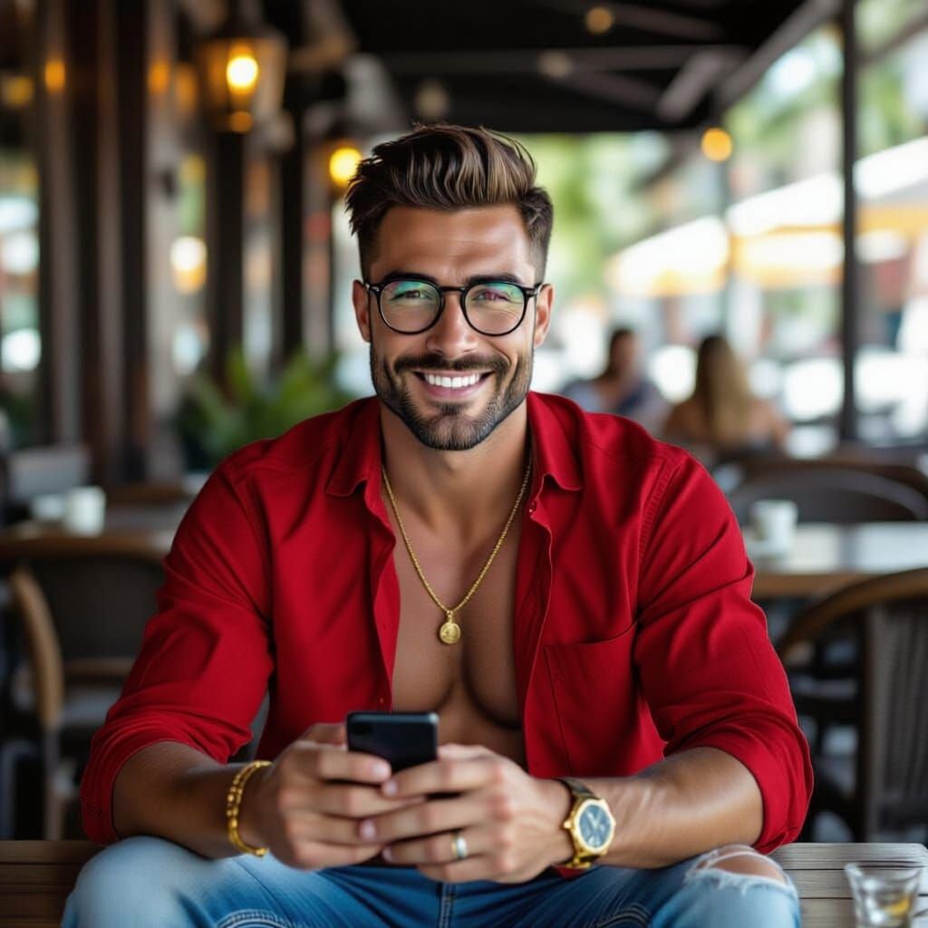 in the foreground: full body figure. very handsome man. 35 years old. 1.90 meters tall. short black hair with well-groomed side parting. light blue green eyes. beautiful very thick eyebrows. well-defined fleshy mouth. well trimmed goatee. thin face. athletic physique with well-defined pectorals. hairy ...