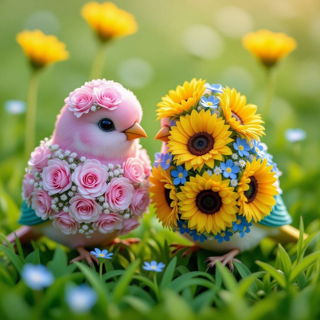 A vibrant image showing two love birds perched in a meadow. One is crafted from pink roses, the other from sunflowers, in a surreal pop art style with soft, dreamy textures.