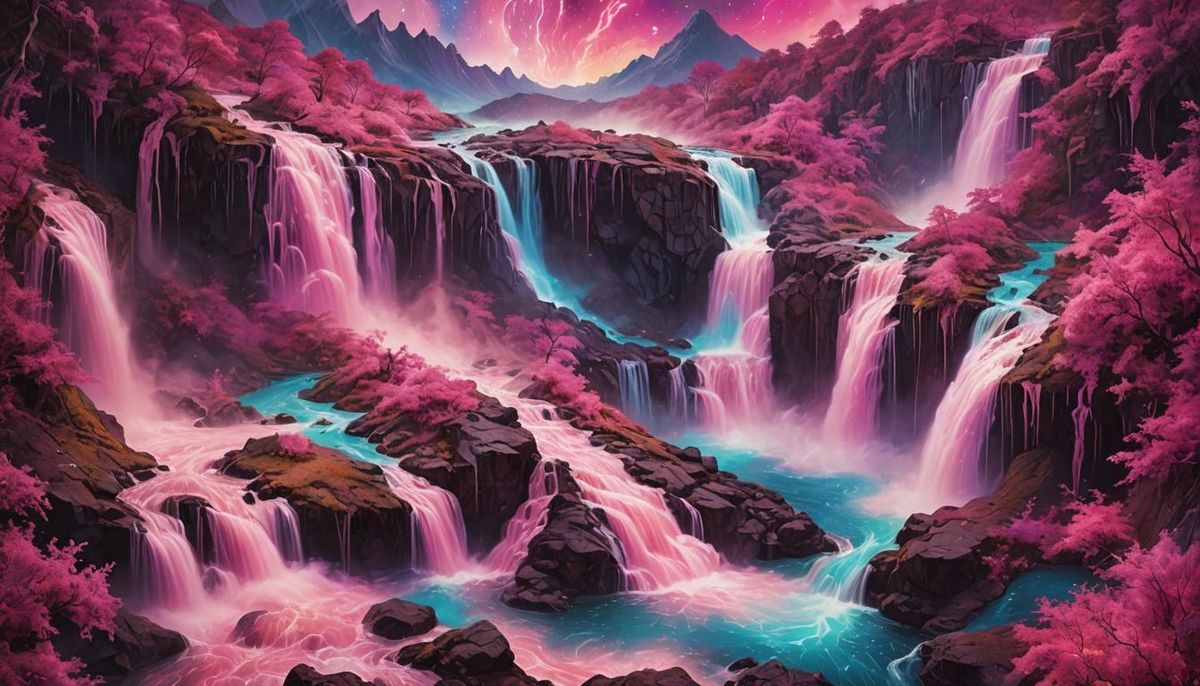 A vibrant mixed media illustration of pink waterfalls cascading into a cosmic landscape. Swirling clouds of nebulas dance with water and iridescent stardust creates a soft, ethereal glow. High detail, surreal, cosmic art.