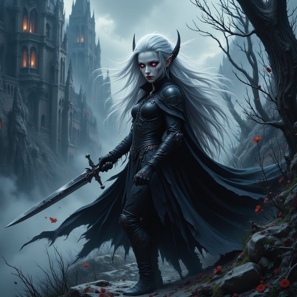 A muscular drow elf with white hair and pink eyes, clad in dark leather and armed with a dagger, walks across a twilight hillside.