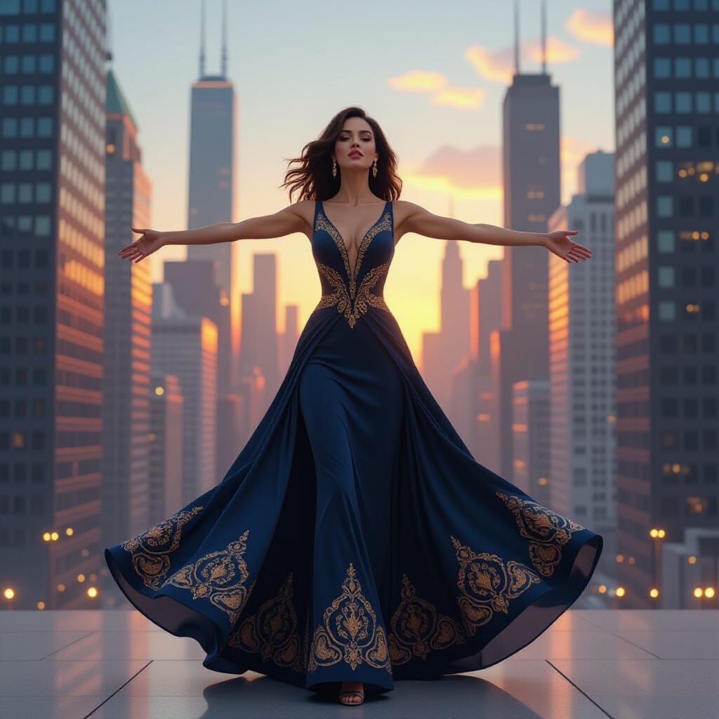 This image shows the spirit of Chicago as a woman in a blue gown. The figure stands in a futuristic cityscape with art deco elements, bathed in warm light in a neon aesthetic.