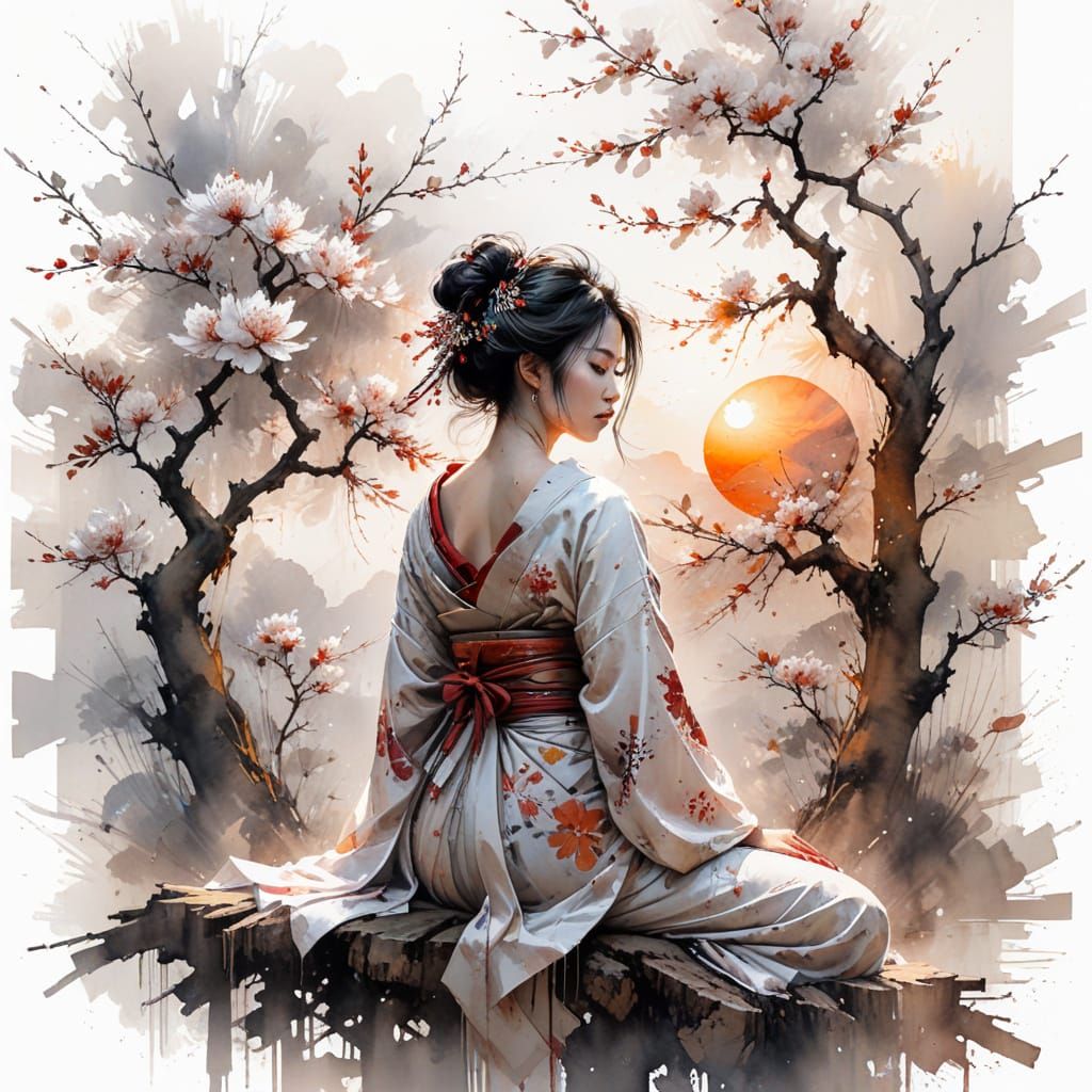 This image shows a traditional geisha meditating peacefully under a sunset blossom tree. The artwork features a stylized watercolour aesthetic with expressive brushstrokes and splashy white space.