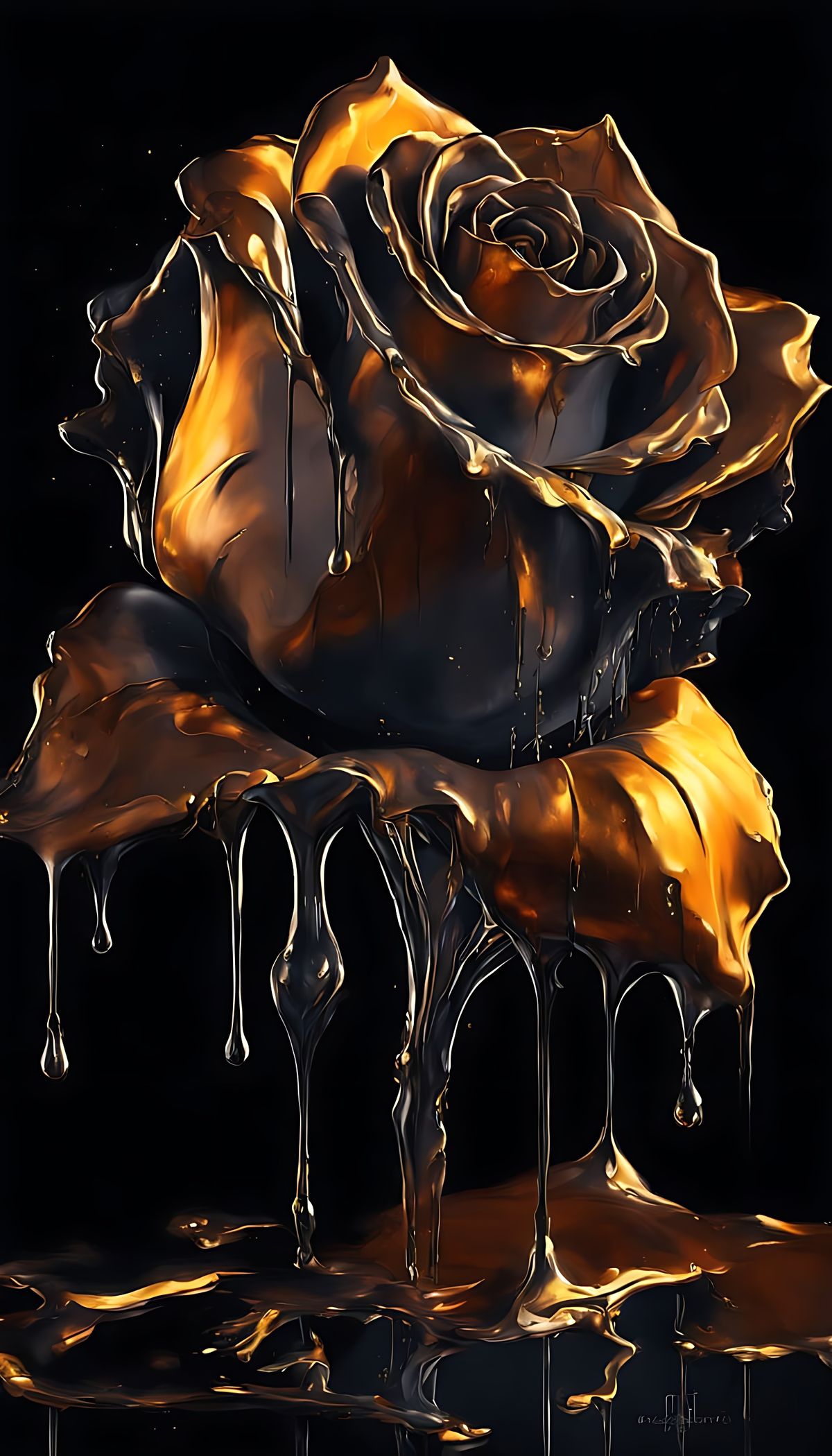 "A surreal digital painting of a single rose made of molten gold and black metal, with realistic dripping textures, glowing highlights, and a dark glossy background. The petals and leaves appear to melt and flow like liquid, in a hyper-detailed, dramatic lighting style, concept art quality."