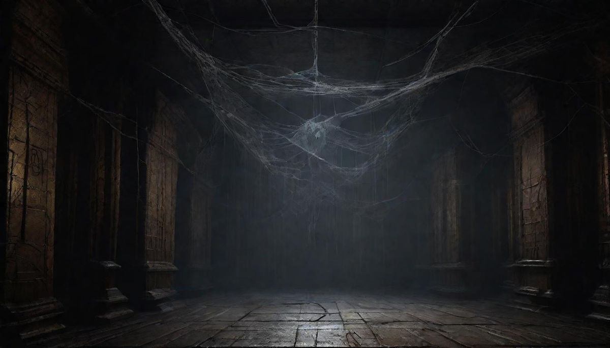 This eerie image depicts a dimly lit dungeon room shrouded in spider webs, evoking a sense of foreboding and mystery. The scene is reminiscent of dark fantasy concept art, with a focus on deep, rich colors and dynamic lighting.