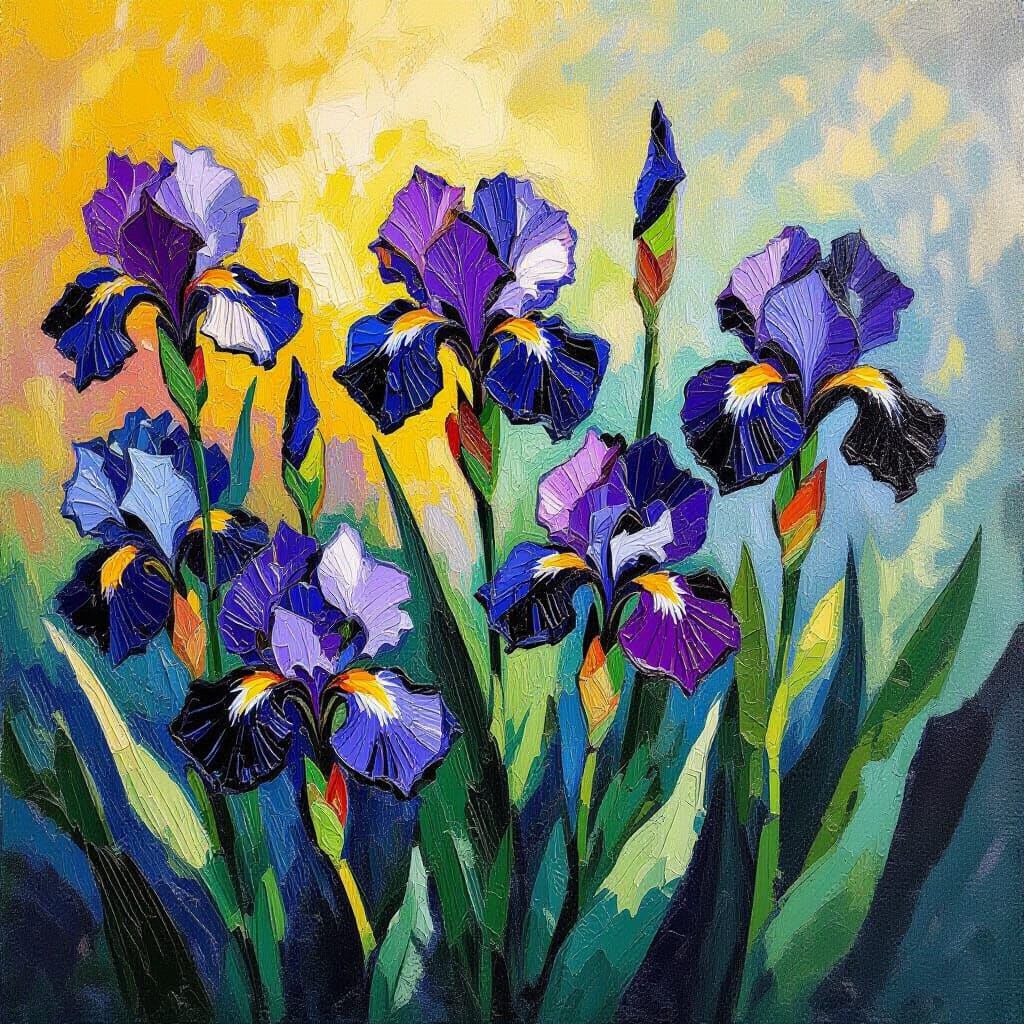 This image features vibrant purple irises in a lively flower border, rendered with heavy impasto texture and energetic brushstrokes. The impressionist style evokes a sun-drenched atmosphere.
