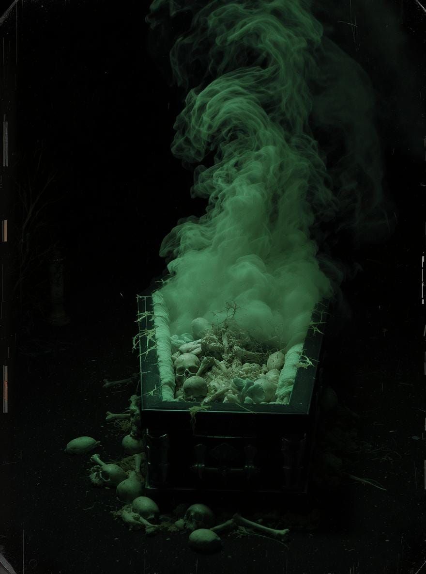 This image shows a coffin emitting smoke, encircled by bones and rats, set against a dark backdrop. The scene is bathed in a nuclear green filter with dramatic lighting and film grain.