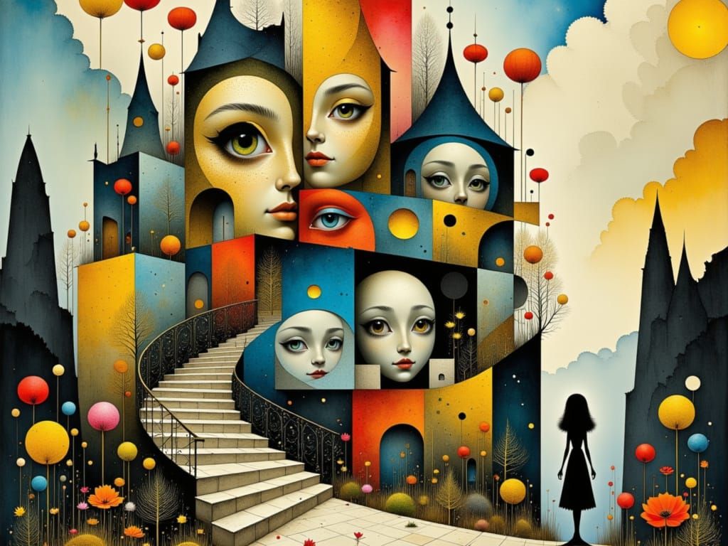 This surreal image depicts Alice from Wonderland amidst a fantastical, Escher-inspired staircase with impossible geometry, surrounded by Klimt-esque ornamentation, abstract patterns, and oversized carnival masks. Disembodied faces blend with architecture, while poppy flowers add a touch of whimsy and bea...
