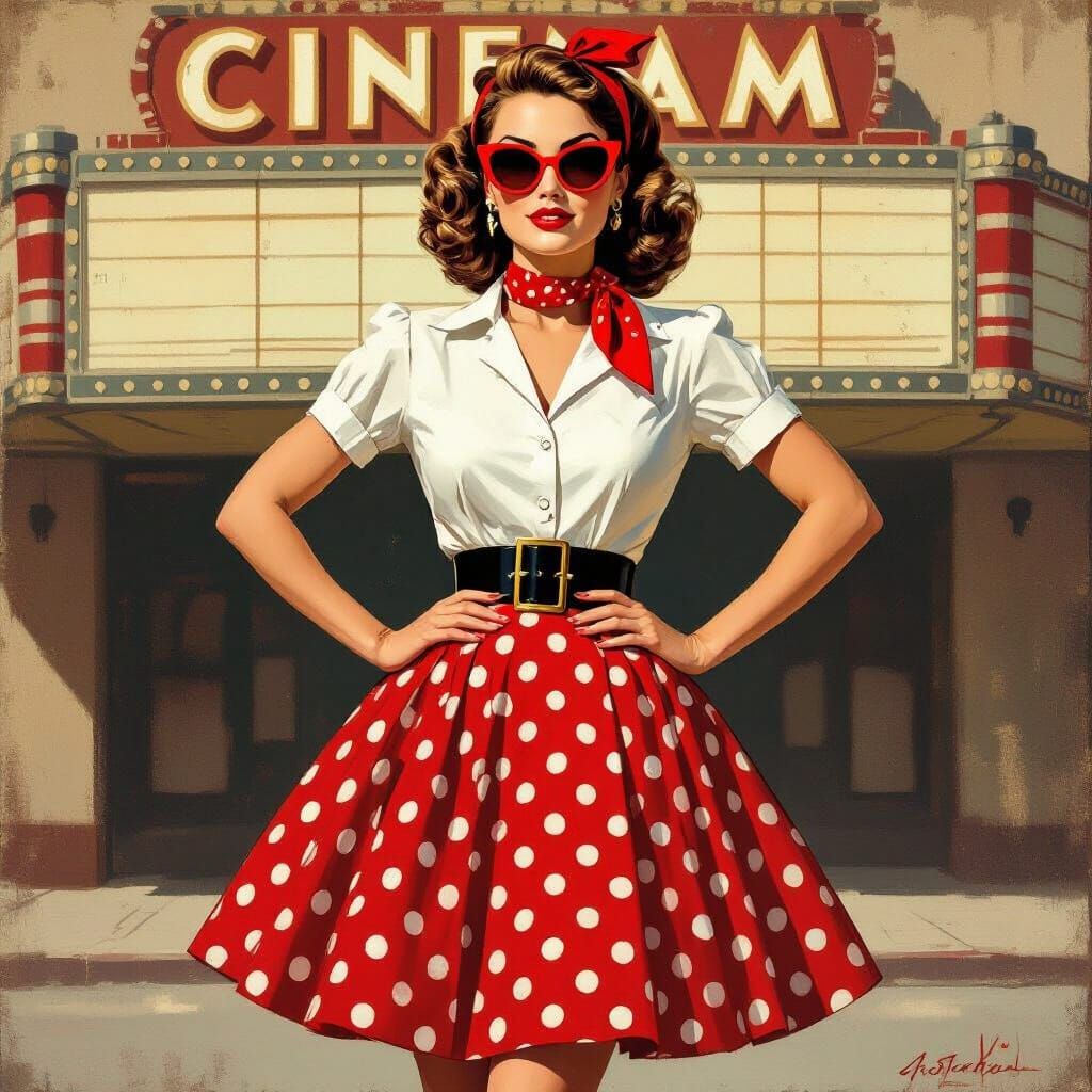 A captivating image shows a stylish woman in 1950s attire posing before a vintage cinema. The artwork, reminiscent of classic Americana, employs warm colors and textured brushstrokes.
