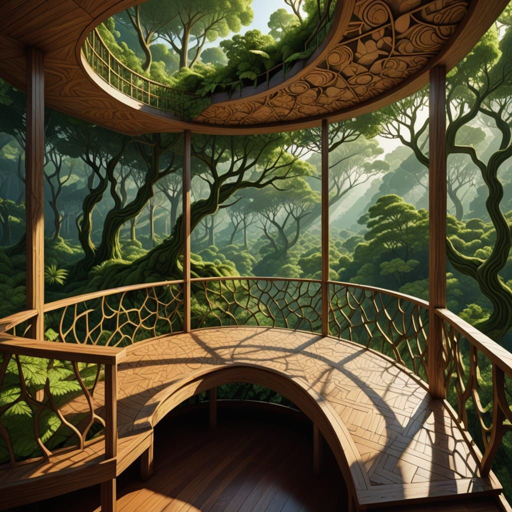 A grid layout interior shot of a leaf-shaped balcony overlooking a forest canopy. The image features abstract vector fractal elements and 3D shading in a vibrating composition.