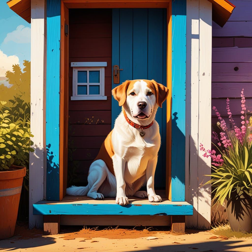 A delightful digital painting of a dog sitting by its doghouse, rendered in a whimsical illustration style with vibrant colors and playful shadows.