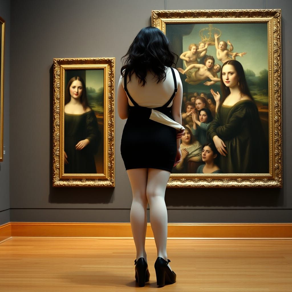 This captivating image shows a beautiful, full-figured woman standing in an art gallery, gazing at a surreal, Renaissance-inspired painting of herself. The artwork exaggerates her features, creating a thought-provoking and cinematic scene.