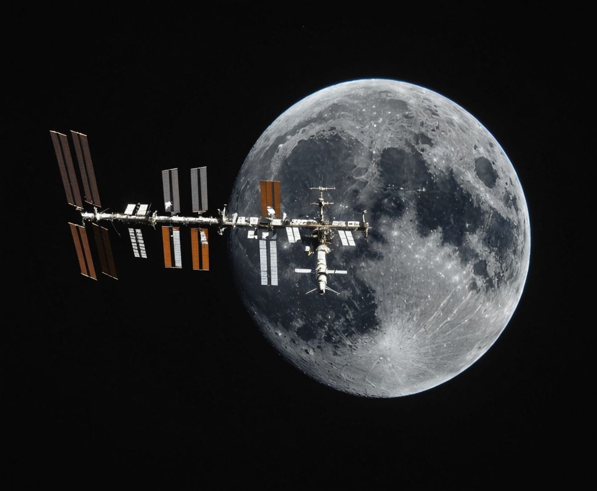 A dramatic image of the International Space Station silhouetted against a bright full moon. The scene captures the stark contrast between the spacecraft and the lunar glow.