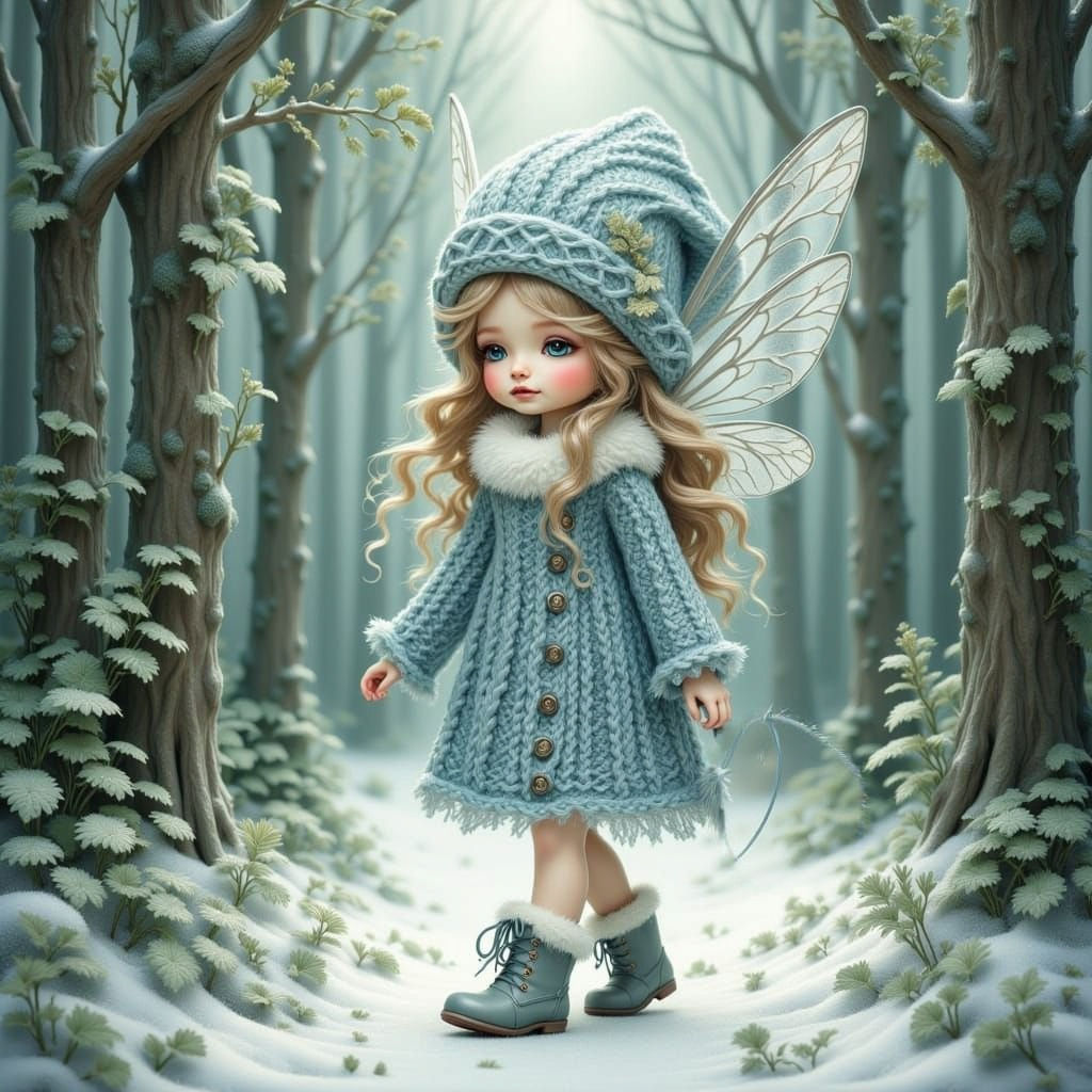 This image features a charming fairy walking through a spruce forest. She is dressed in a knitted ice blue dress with fur trim and a matching gray hat.