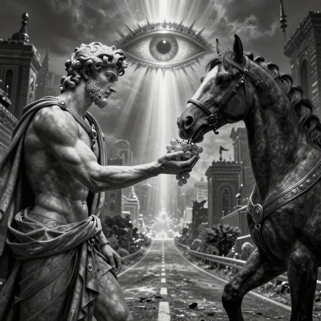 michelangelo guy gives small crystal bunch of grapes transparent pur sang horse who eat grape, in the epic road of city of shamballah in background with third eye, ray of lights between characters, ultra deep contrast, dramatic painting scene, alien ...