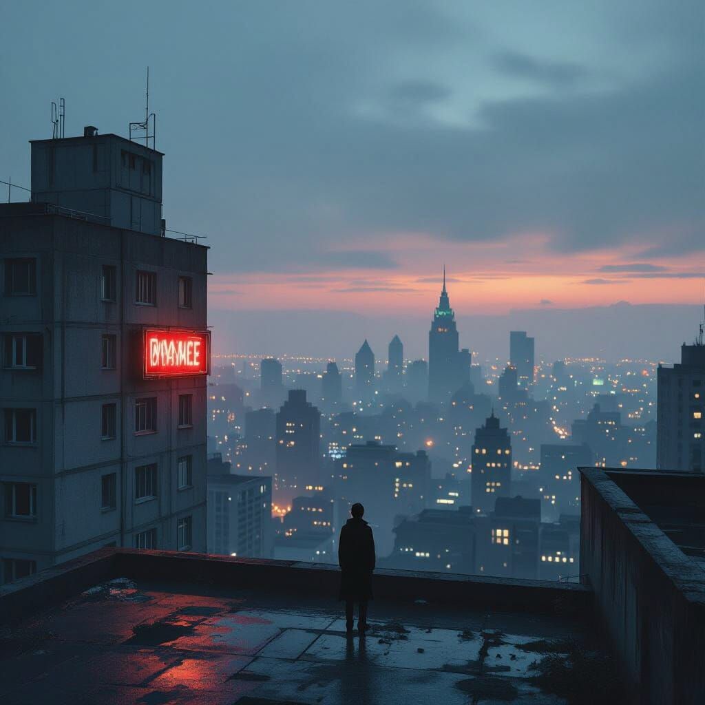 This image shows a lone figure on a rooftop surveying a vast, deserted city at dusk. The scene features brutalist and art deco architecture, illuminated by a flickering neon sign, evoking profound isolation in a desaturated, moody style.