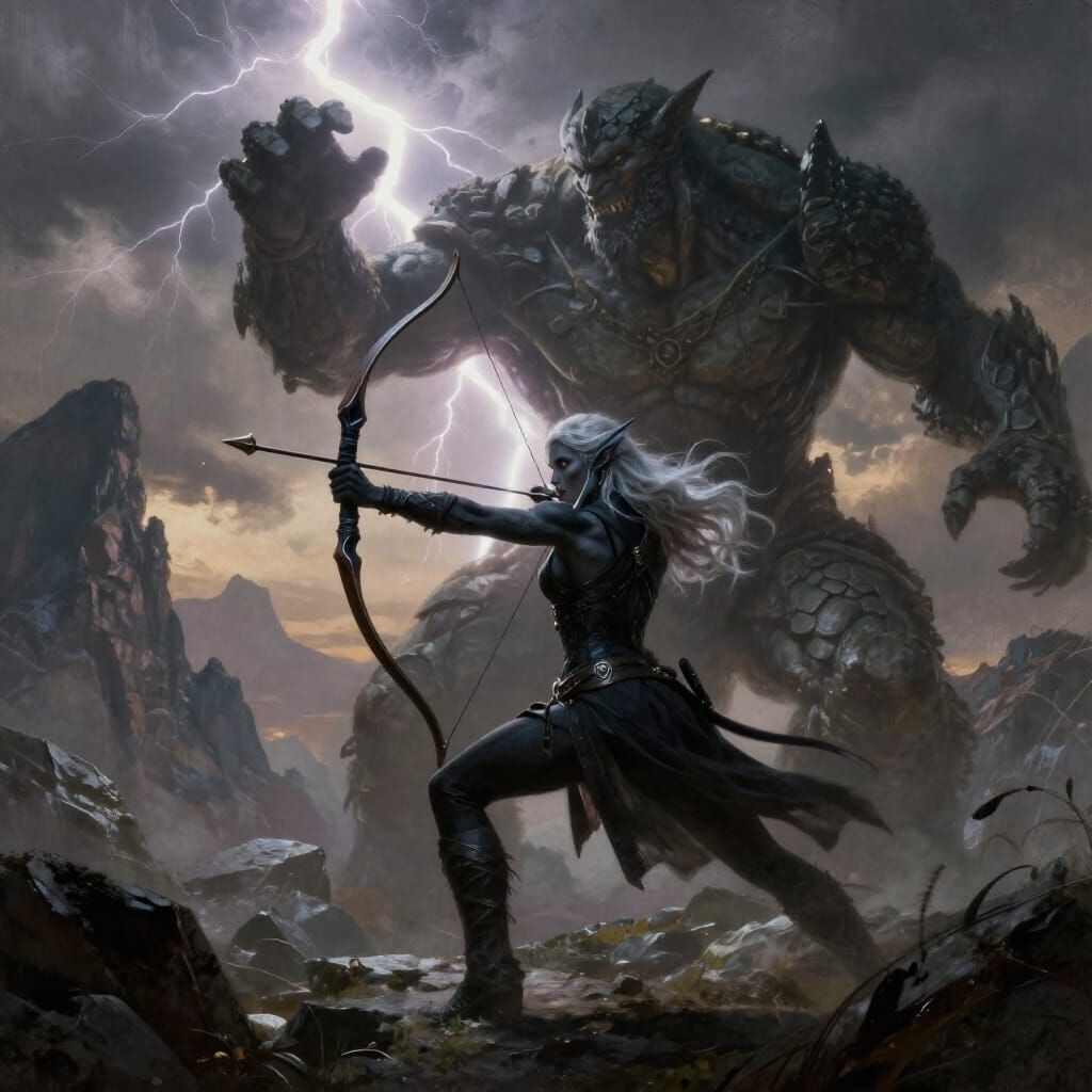 This image shows a dark elf archer with obsidian skin battling a giant with stony skin in a mountain range. Rendered in a dramatic, painterly fantasy art style with a moody color palette.
