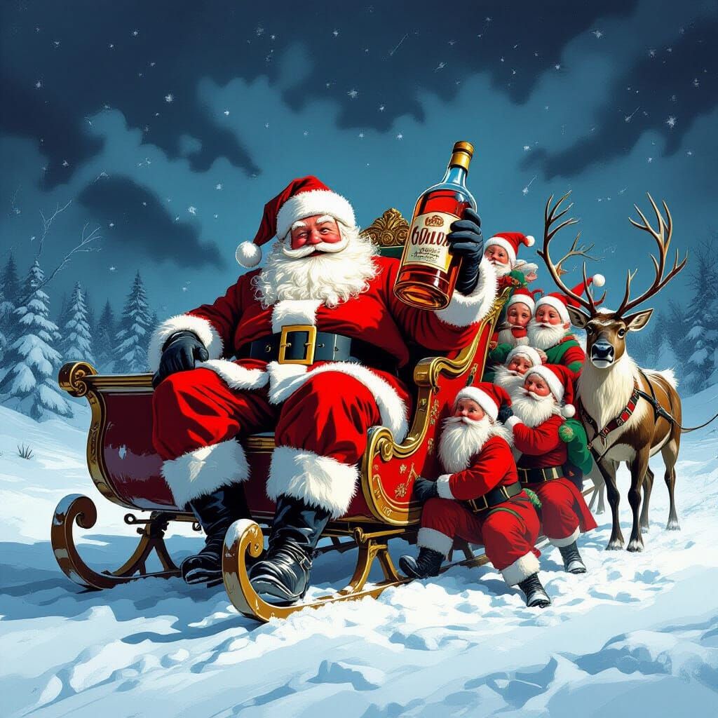 This striking image depicts Santa Claus and weary elves in a desolate, snow-swept landscape, rendered in a gritty, comic noir style with deep shadows and stark contrasts.