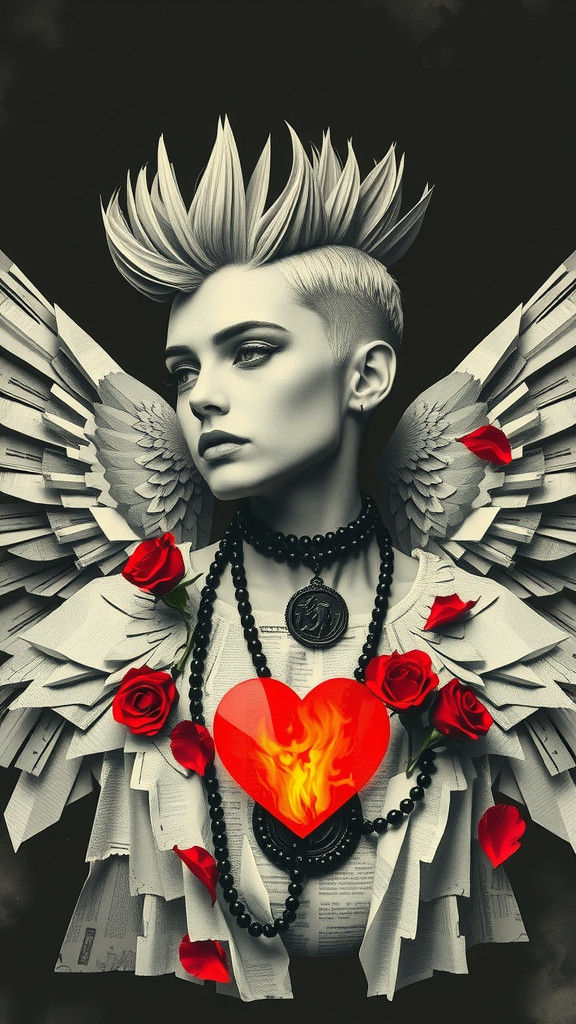 A black and white photogram of a winged model blending religious symbolism with punk aesthetics. Dada-inspired collage elements create a surreal, experimental feel, featuring vibrant hairstyle and torn paper accents.