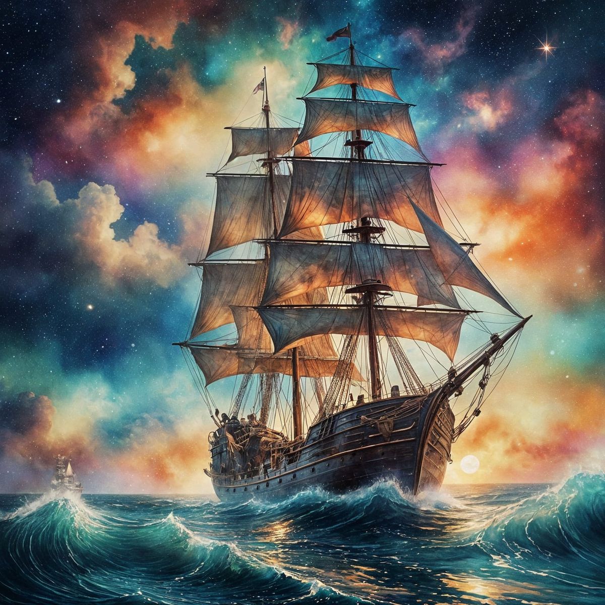 This image shows a pirate ship sailing on the ocean under a colorful, atmospheric sky. The scene is rendered in a soft, dreamy watercolor style with galactic colors.