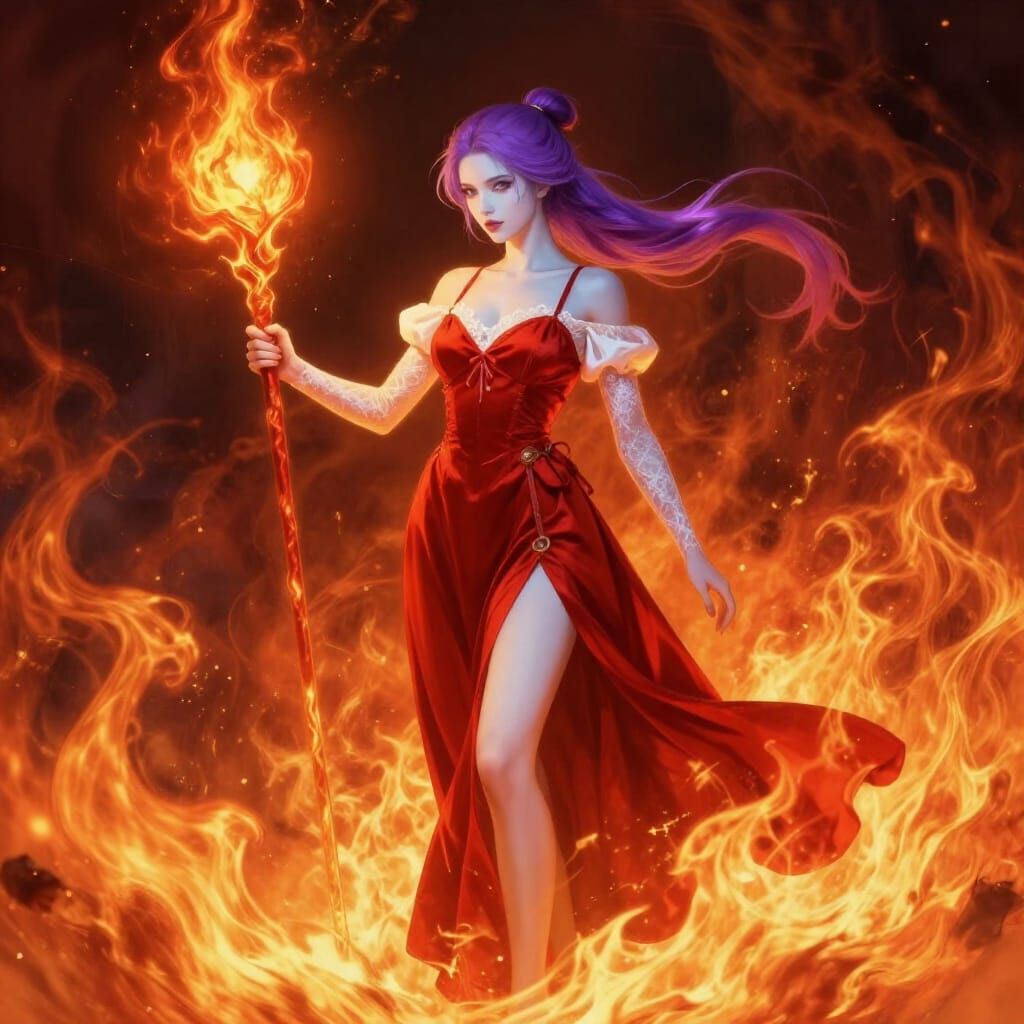 This dramatic fantasy art depicts a pale woman with purple hair in a red dress, wielding a glowing staff amid swirling flames. Her attire features white lace, and the scene is lit with vivid orange and red light.