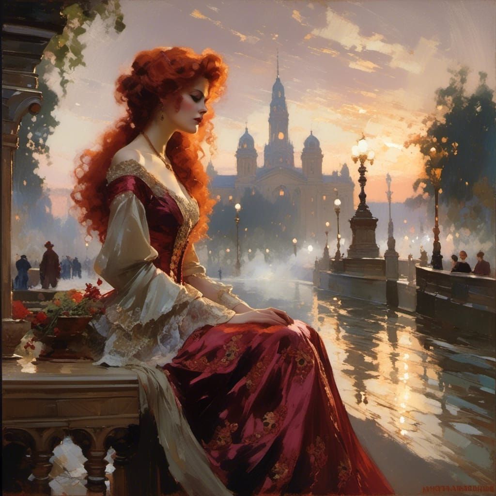 This image shows Mina Harker as a Victorian vampire with red curly hair. The portrait features light gold and crimson colors and dreamy vignettes in a soft, romantic style.