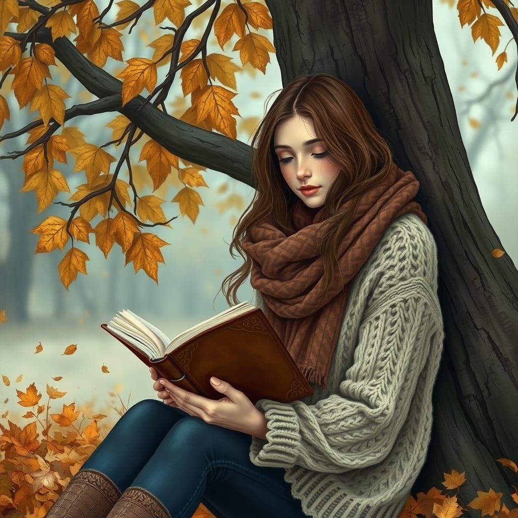 A serene image of a young woman reading a diary beneath a tree amid falling leaves. She is dressed warmly and captured in a whimsical, dreamy style with intricate textures and a subtle color palette.