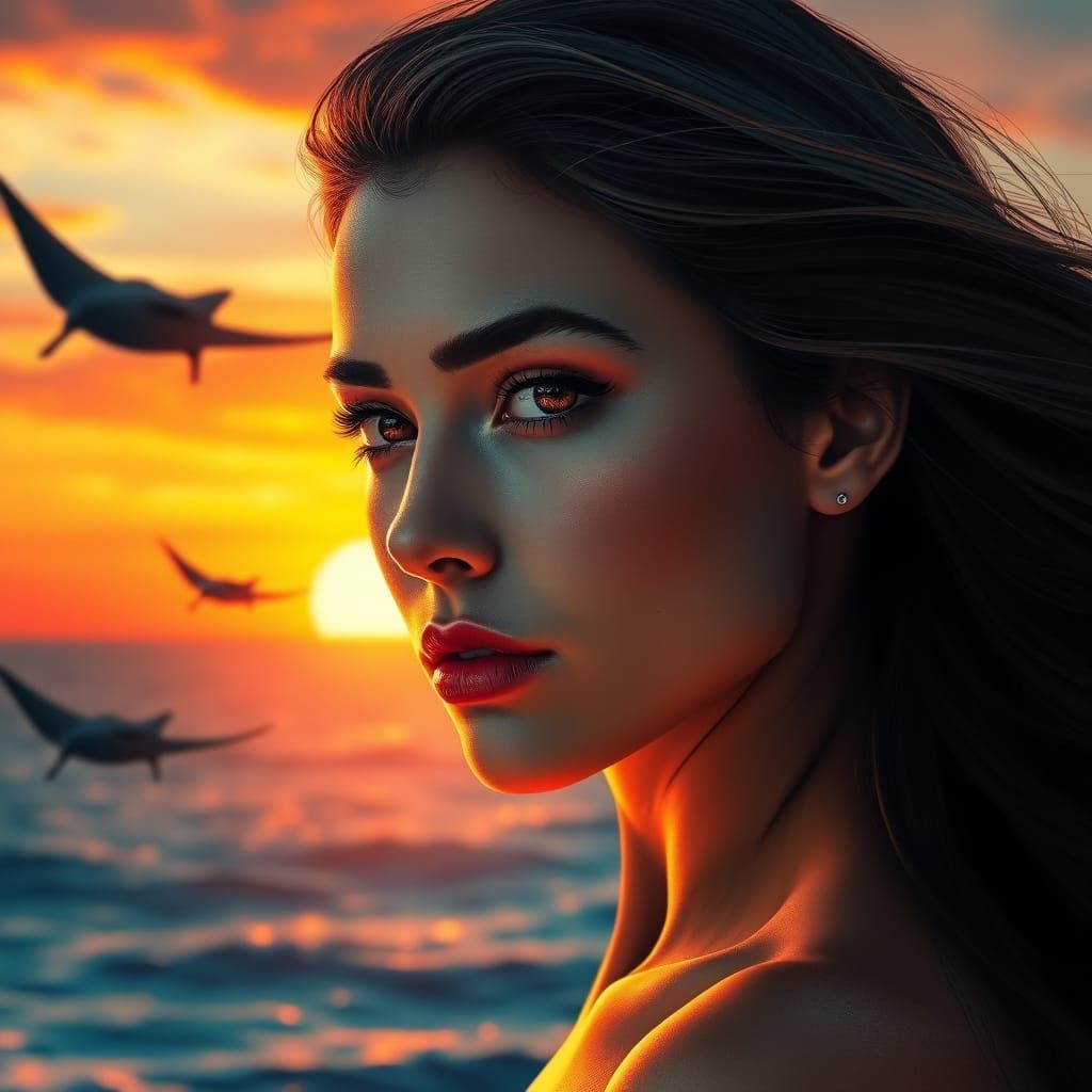 This image captures a tranquil ocean scene at sunset, with sting rays gliding in the distance, accompanied by a detailed portrait of a woman lost in thought, rendered in a blend of Art Nouveau and hyperrealistic styles, evoking a sense of serenity and depth.