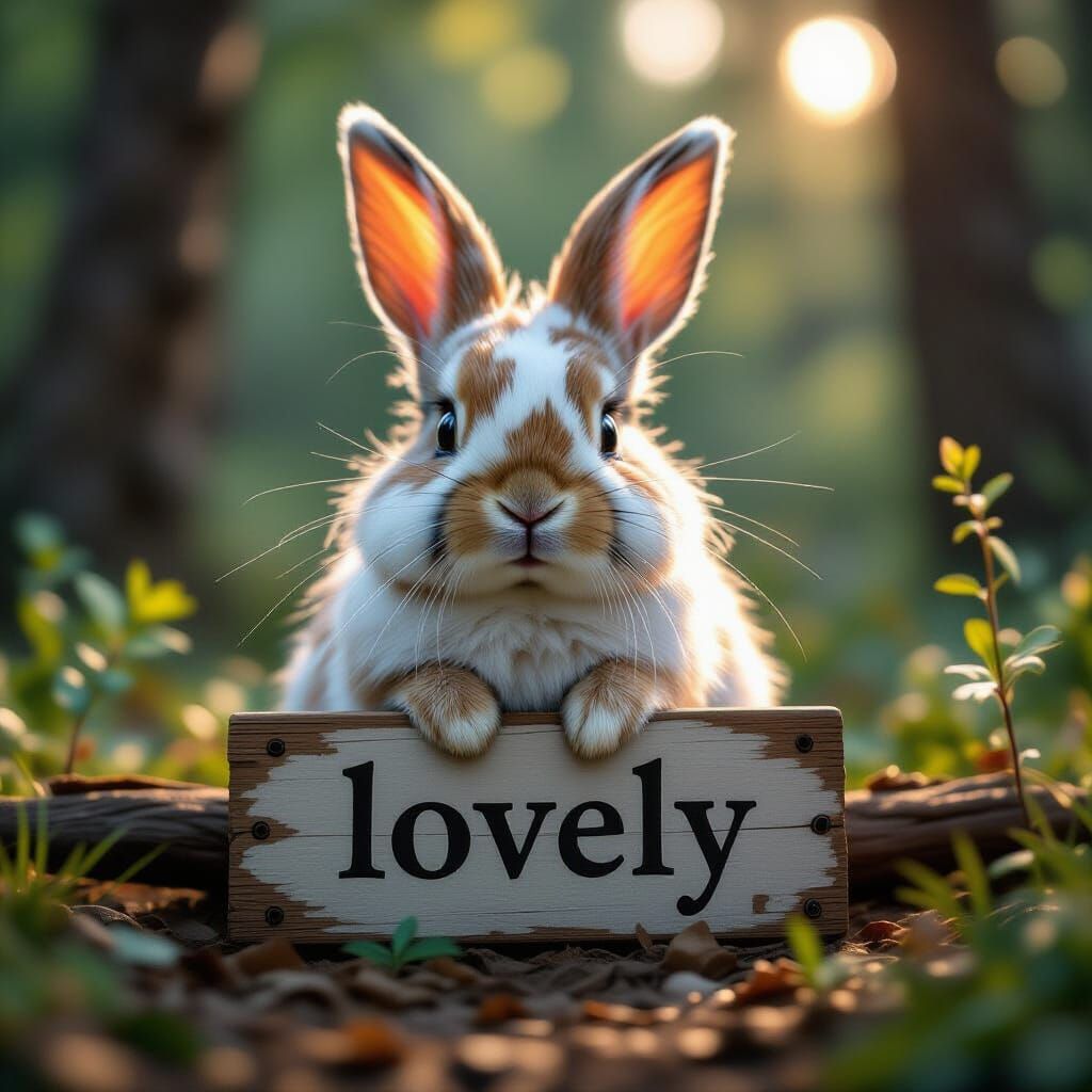 This image presents a beautiful rabbit with vibrant, glassy fur, holding a sign that reads 'lovely'. Shot in a cinematic style with film grain and dramatic lighting, it evokes an atmospheric masterpiece.